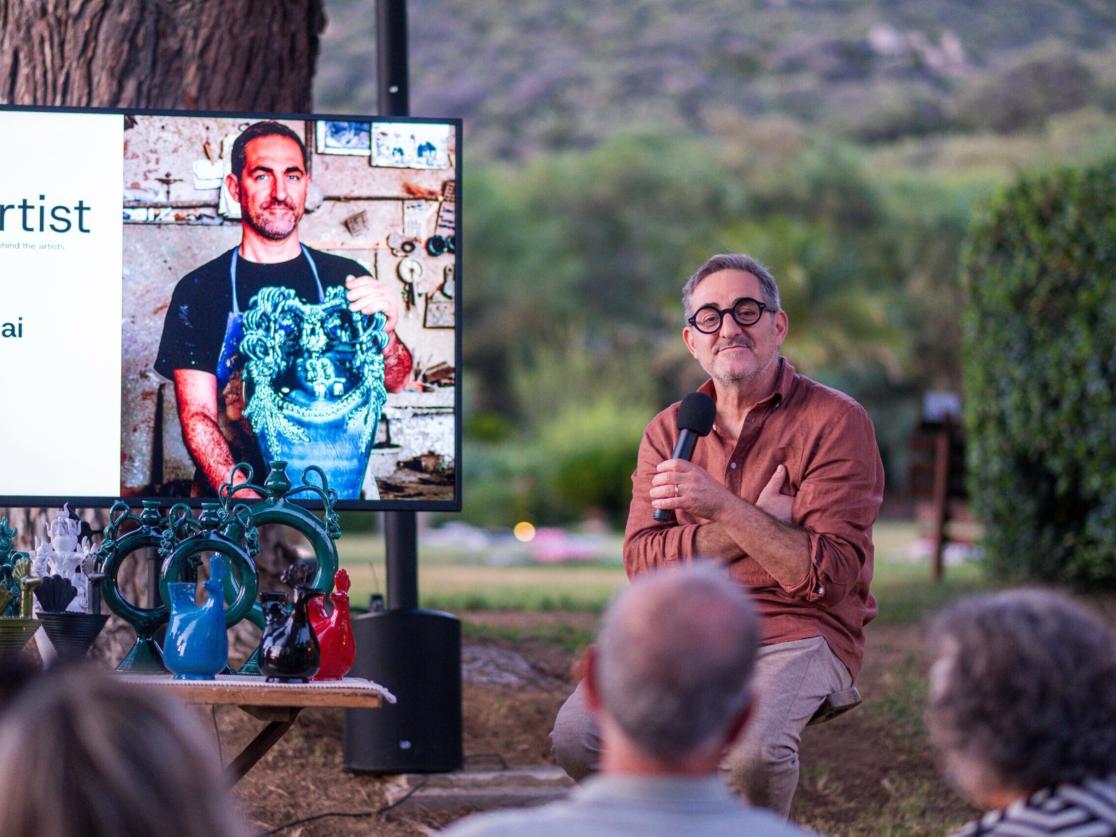 Uno dei momenti più intensi della serata è stato il racconto dell’anfora della sposa, un’antica tradizione sarda che Walter ha scelto di reinterpretare. Una forma che porta con sé simboli di fertilità, memoria e amore. Un’arte che affonda nelle radici ma che guarda al futuro, viaggiando tra gallerie internazionali, fianco a fianco ad altri protagonisti della scena sarda come Pinuccio Sciola.